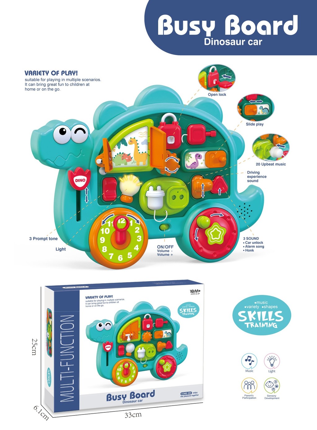 The Busy Board Dinosaur Car is an interactive learning toy designed to support early childhood development through play. With multiple buttons, switches, locks and rotating parts, children can explore different actions while improving fine motor skills and coordination.